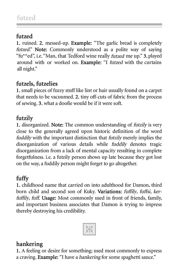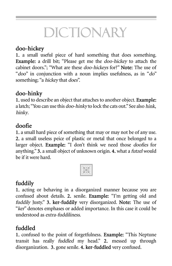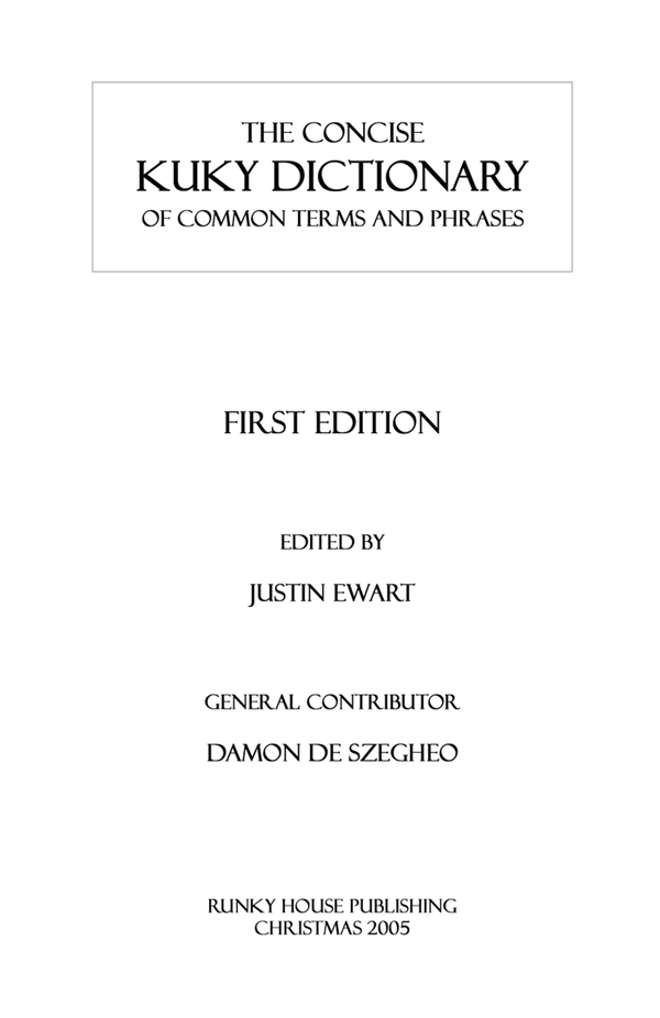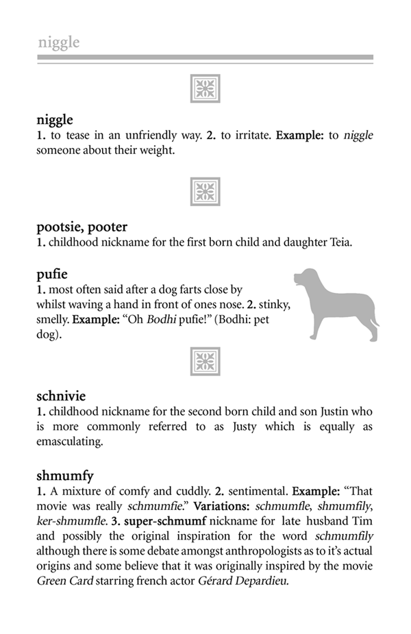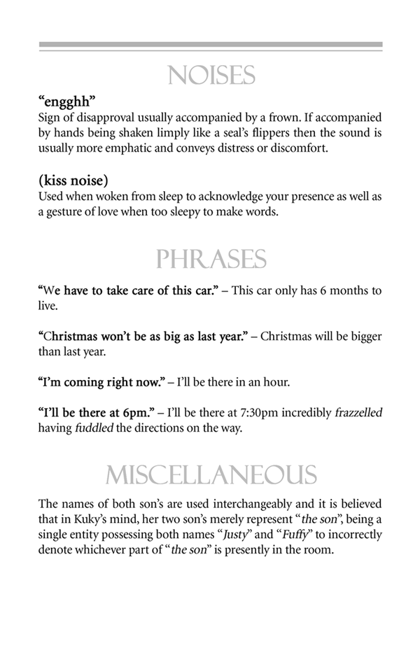 We affectionately present the Kuky Dictionary. Created by her two sons Justin and Damon in 2005 as a Christmas present and presented to friends and family, this gag gift tickled Mom to no end. If you knew her, I'm sure you will recognize many of her "Kuky-isms" and I'm sure there are still more that we left out.